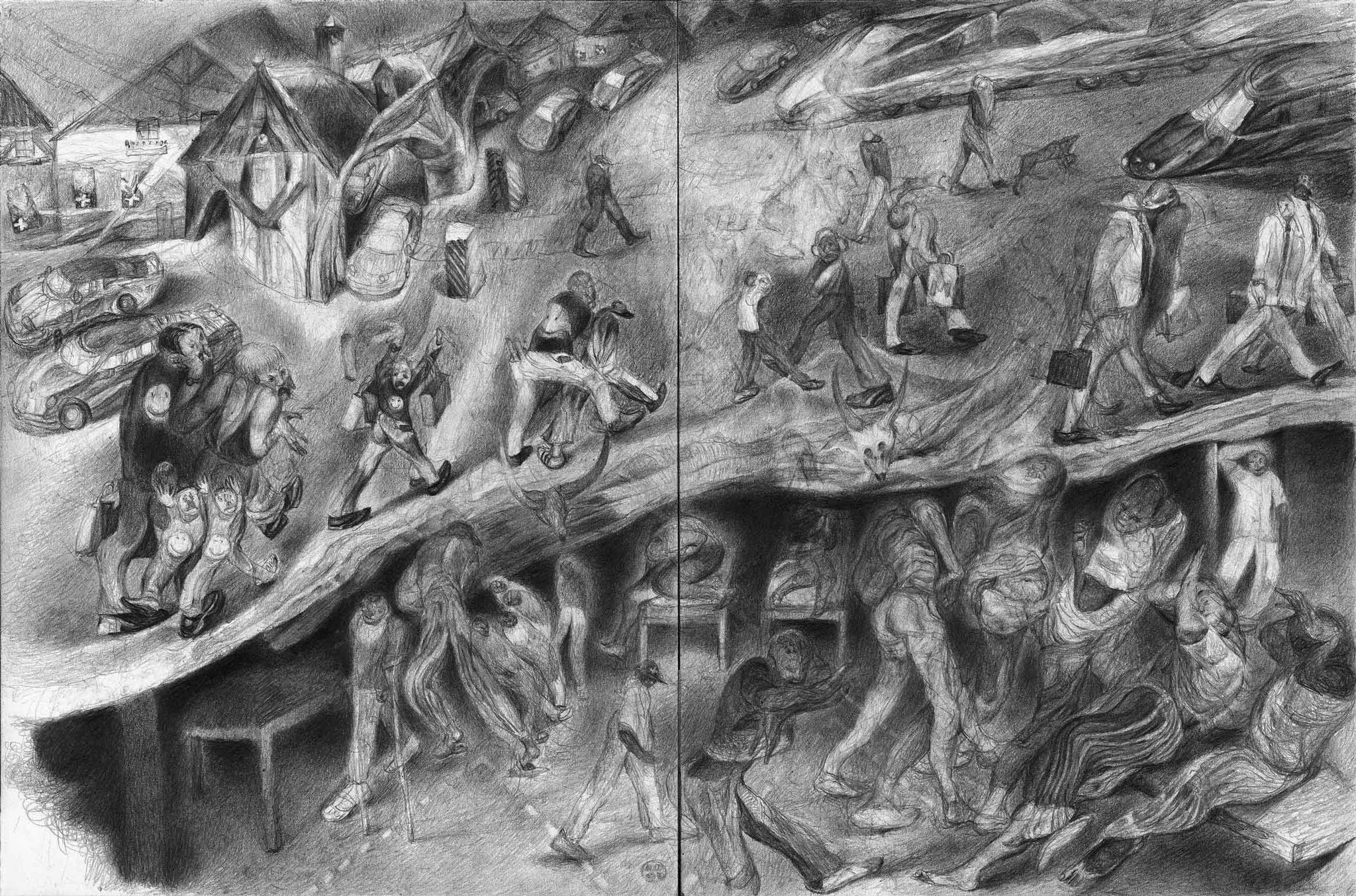 Fragments, closeups and hints are the building blocks of the simultaneously pleasurable and confusing visual world of Matthias Wyss’ drawings, creating a multilayered narrative about what it means to be human. The thin line between reality and dream is frequently hard to make out in these drawings. Figures that remain somewhat indeterminate seem to rise from turbulent, animated elements, soaring euphorically or writhing in agony. They merge with or emerge from unfathomable landscapes.